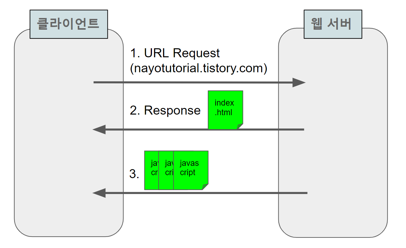 - 클라이언트(브라우저)는 해당 자바스크립트 파일을 다운해 처리하고 기본 페이지가 화면에 표시되게 됩니다.