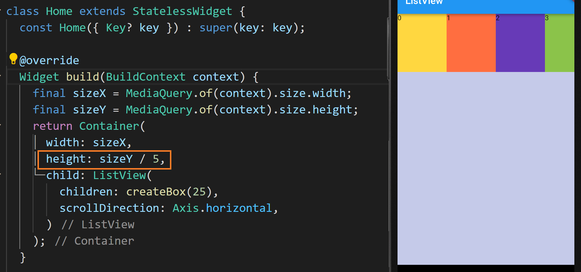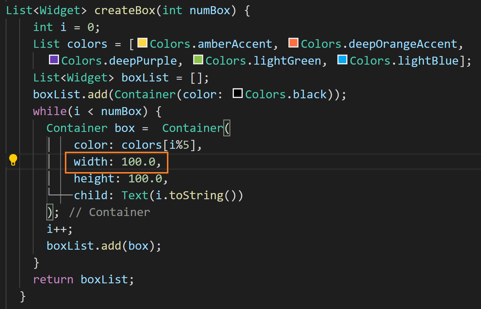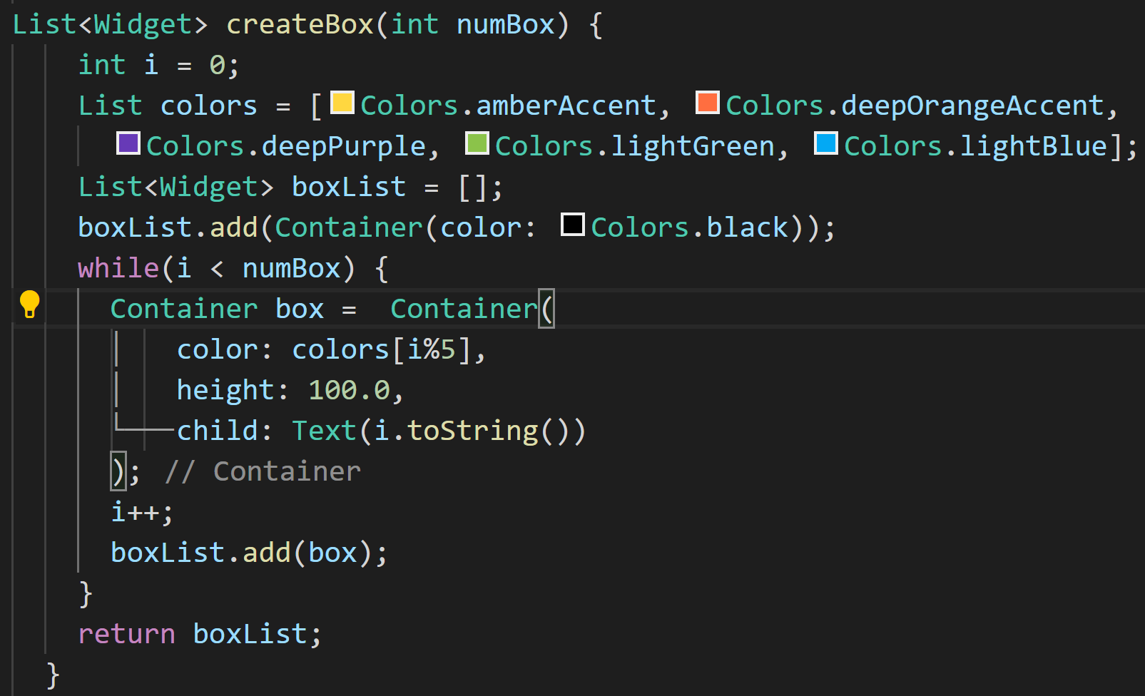 건네받은 매개변수의 수만큼 반복문을 돌며 색상이 깔린 높이 100의 Container의 리스트를 리턴해주고 있습니다. 상자의 색깔은 다섯 가지 색깔이 반복적으로 사용하게 됩니다.