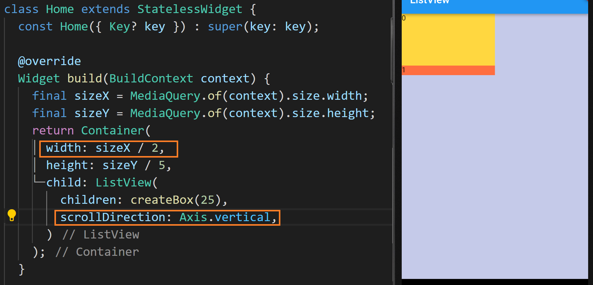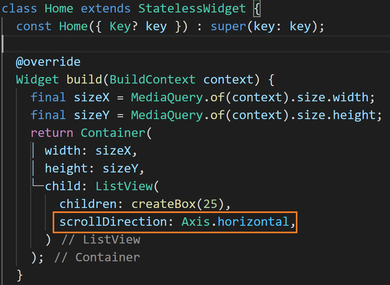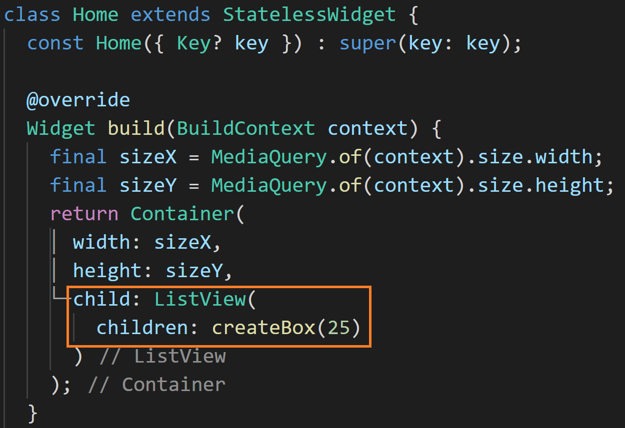 Home 위젯은 StatelessWidget이고 build 메소드에서 디바이스 화면을 꽉 채우는 Container를 리턴하게 됩니다. 리턴되는 Container 위젯의 child 속성의 이번 포스트의 메인 토픽인 ListView가 존재하고 있습니다. ListView의 children 속성에 createBox(25)란 메소드를 호출하고 있는데요. createBox는 List<Widget>을 리턴하는 메소드로 입니다. ListView 안의 자식 위젯들이 어떻게 배치되는지 특징을 알아보는 것이 이번 포스트의 목적입니다.