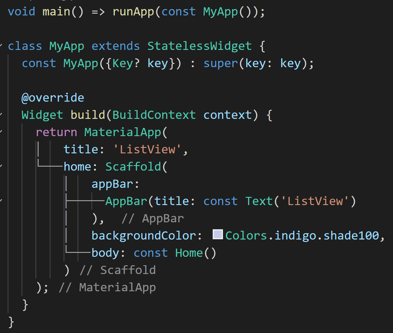 부트스트랩 되는 MyApp은 StatelessWidget입니다. MaterialApp을 반환하고 있으며 Scaffold의 body에 Home 클래스를 지정해 두었습니다.
