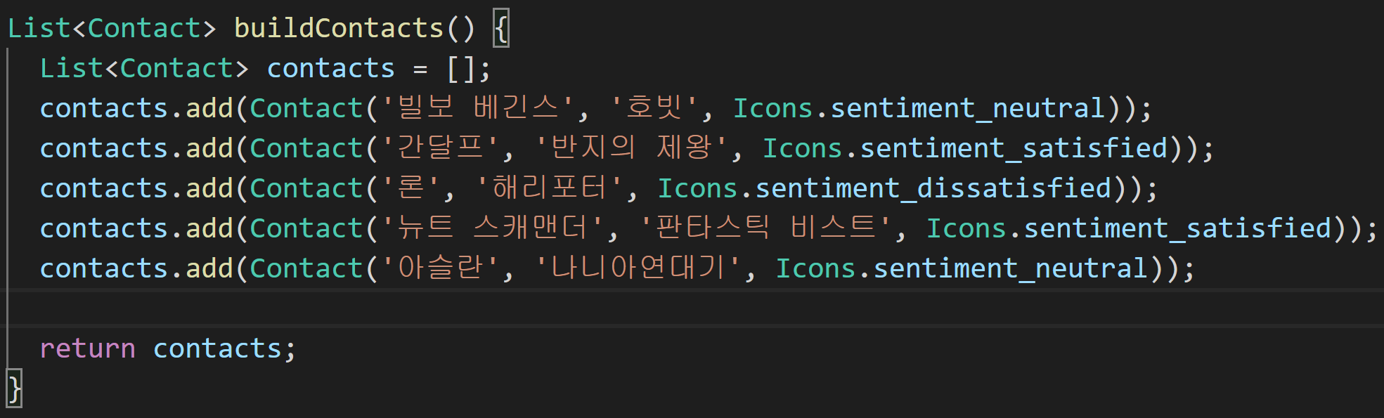 1. contacts 변수는 buildContacts 메소드를 호출해 연락처 데이터를 담고 있습니다.