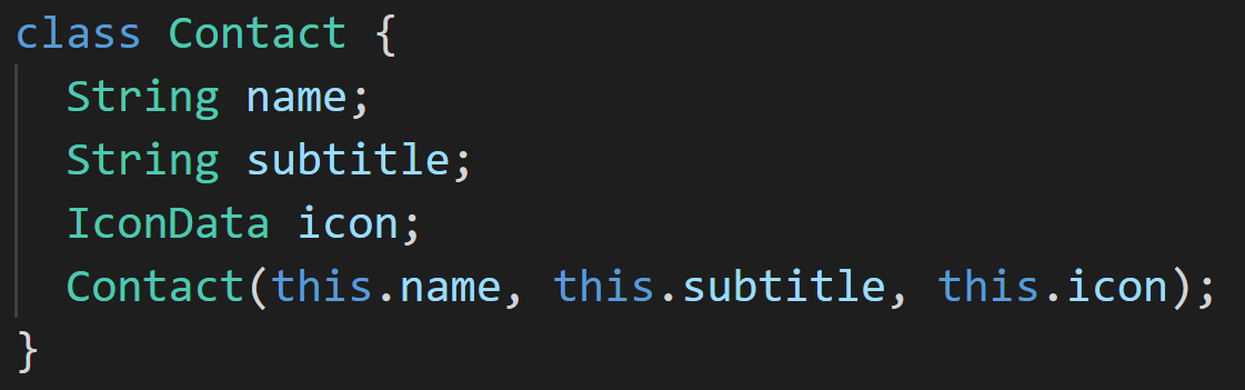 위의 예가 ListTile로 만든 레이아웃입니다.. ListTile은 고정 높이의 단일행의 위젯입니다. 그리고 텍스트와 선행 아이콘, 후행 아이콘을 포함하고 있습니다. ListTile에는 title 속성이 있으며 필수 항목입니다. 그리고 subtitle(최대 두줄), leading, trailing, 속성을 가지고 있습니다. 지금 만드려고 하는 연락처 리스트에 매우 적합한 위젯입니다.