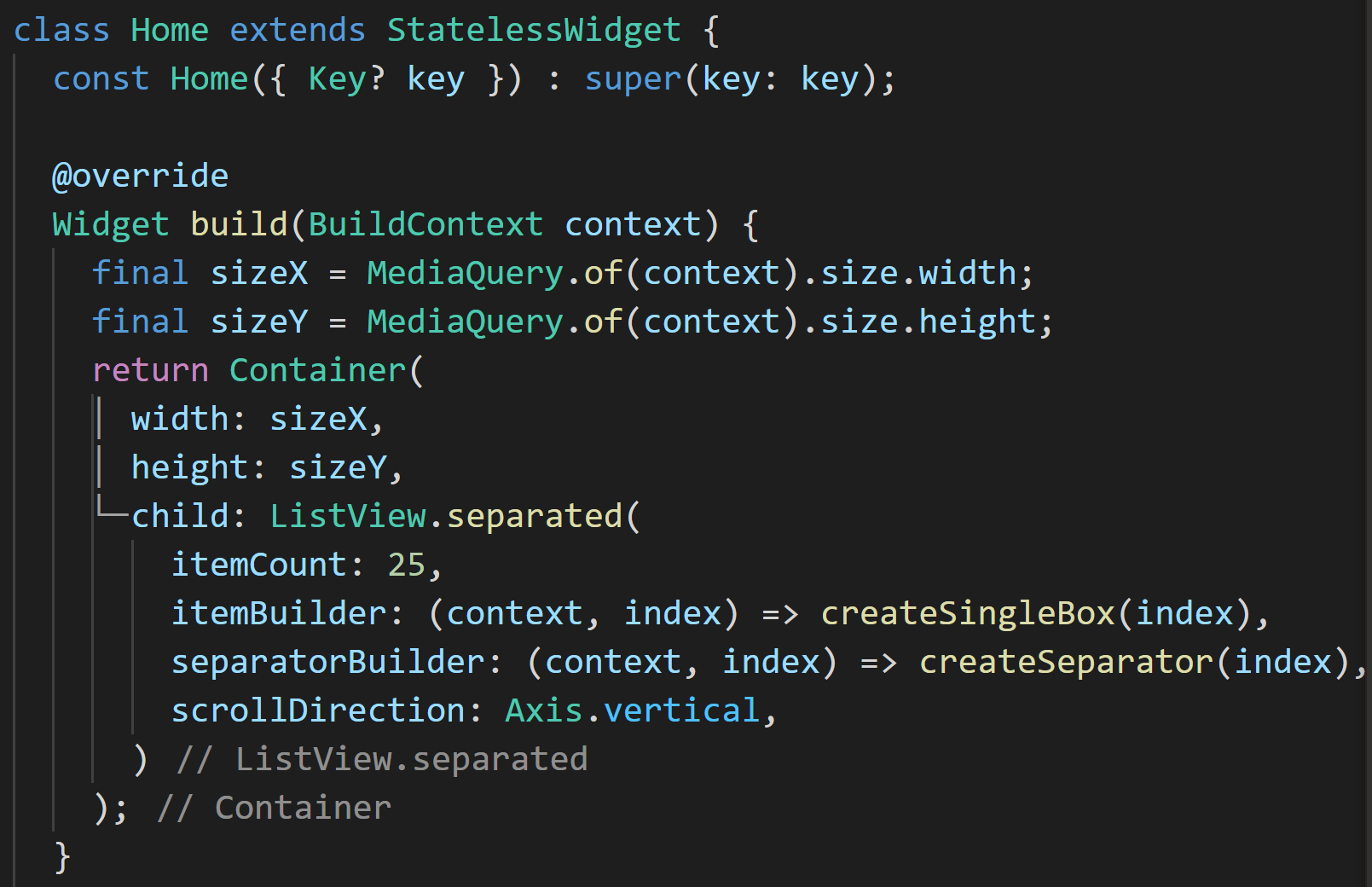 Container위젯의 child로는 ListView의 separated 생성자로 Listview 위젯을 만들고 있습니다. separated 생성자의 자세한 내용은 이쪽 포스트를 참고해 주세요.