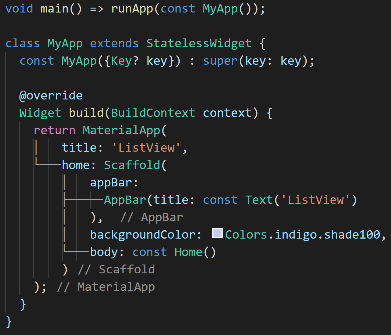매터리얼 앱으로 home 속성에 Scaffold 위젯을 설정하고 있고 body 속성에 다시 Home 위젯을 불러오고 있습니다. Home 클래스는 StatelessWidget으로 build 메소드에서는 화면을 꽉 채우는 Container를 리턴해 주고 있습니다.