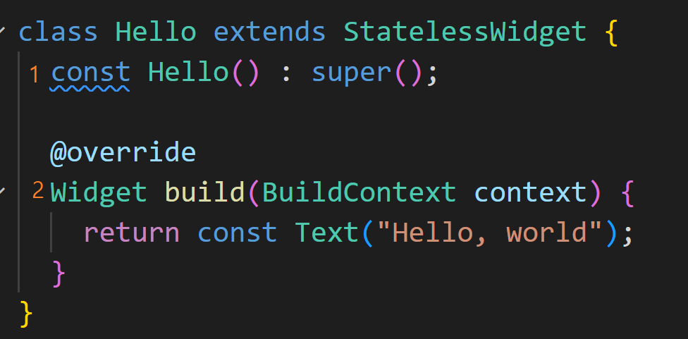 2. statelesswidget을 상속할 때는 build 메소드를 재정의 해야 합니다. build 메소드에서 리턴해야 하는 것은 아시다시피 위젯입니다. 예제의 경우 정적 위젯으로 동일한 사용자 인터페이스인 Hello,world라는 텍스트가 포함된 텍스트 요소를 반환하고 있습니다.
