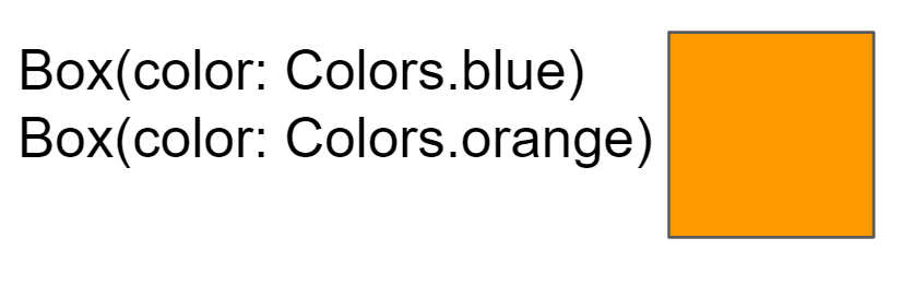 상자 생성자가 있고 생성자의 프로퍼티로 색상을 전달해서 파란색 사각형을 렌더링 하게 됩니다. 오렌지 상자를 렌더링 하려면 다른 속성을 전달해야 합니다.