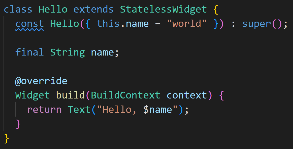 이제 생성자에 this.name이라는 프로퍼티가 있는 걸 주목해 주세요. 기본값이 설정되어 있지만 생성자를 통해 name 프로퍼티를 전달할 수 있습니다. 그런 다음 build 메소드에서 name 프로퍼티를 사용하여 렌더링 대상을 정적 텍스트인 Hello, world 대신에 name을 설정해 주고 있습니다. 만약 name 프로퍼티가 제공되지 않는다면 world가 기본 설정이 될 것입니다. stateless widget이라고 하면 흔히 상태가 없는 위젯이라고 생각하게 되는데 엄밀히 따지고 보면 stateless 위젯에도 이런 관점의 상태는 존재하다는 게 생각해볼 점입니다.