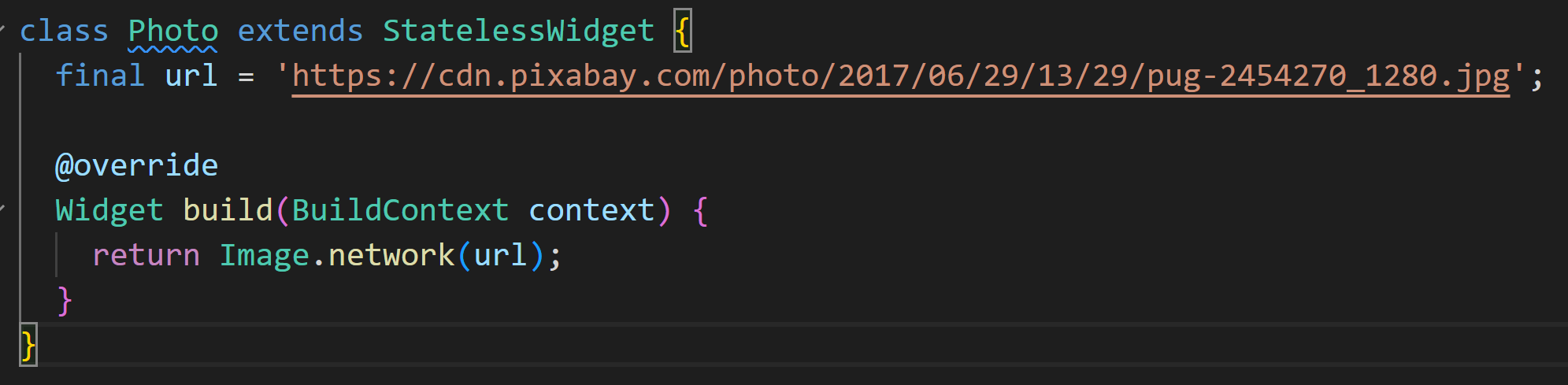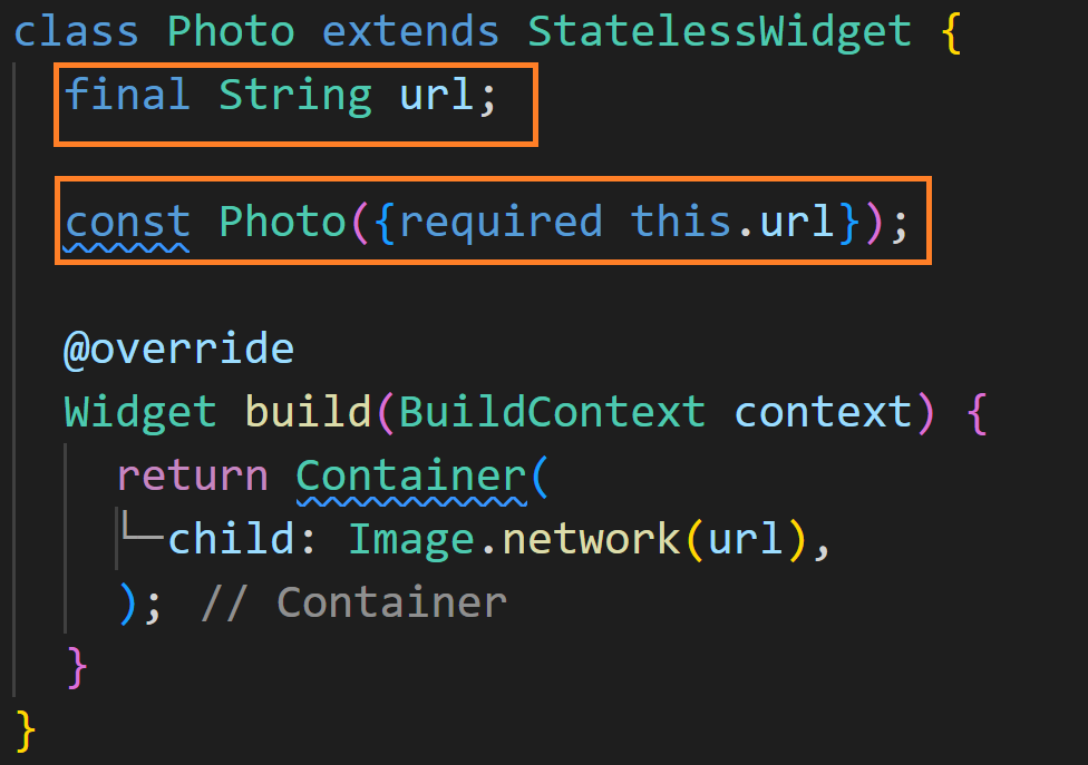 Stateless 위젯인 Photo 클래스를 만들어 주었습니다. url이라는 final 필드를 가지고 있고 클래스가 생성되면서 url 주소가 바뀌는 걸 원하지 않기 때문에 사진의 주소를 고정값으로 가지고 있습니다. build 메소드에서는 Image의 network 생성자를 사용해서 Image위젯을 만들고 있습니다. 이미지의 소스는 단순히 고정 url값을 넣어주고 있습니다. 이것으로 정적 위젯의 작성은 끝이 났습니다.