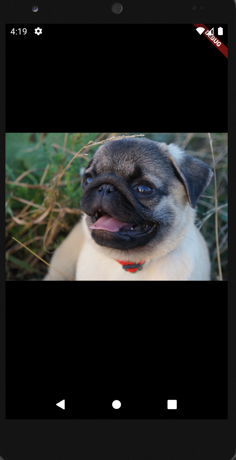 귀여운 퍼그 사진이 화면에 나타나고 있습니다. 단순 정적 위젯 하나가 화면에 그려져서 나타나는 결과입니다. 정적 위젯이므로 화면이 갱신되거나 하는 일은 존재하지 않습니다. 정적 위젯을 만들어 봤으니 상태가 주입된 위젯을 만들어 보도록 하겠습니다.
