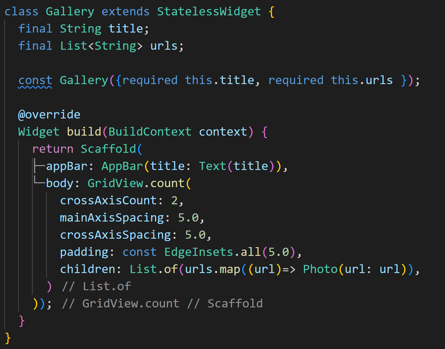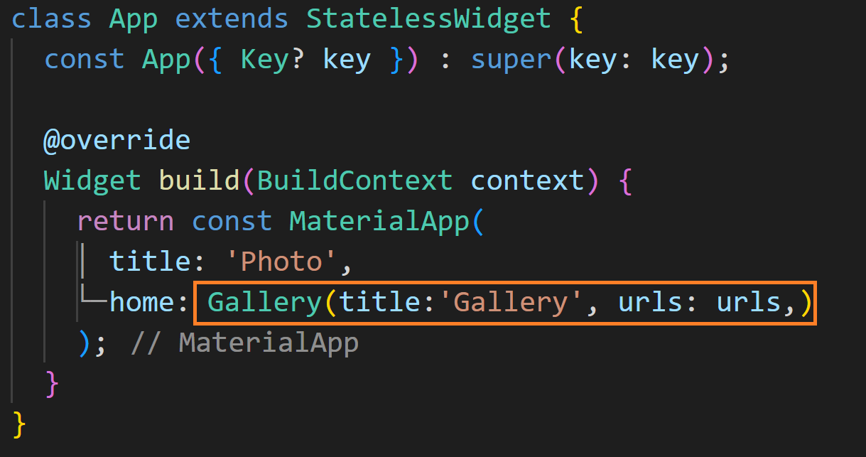 Gallery는 위젯에 상태를 주입할 것이고, 여기서 상태는 final 문자열 값입니다. 그리고 결과적으로 갤러리의 제목으로 설정됩니다. urls역시 위젯에 주입되는 상태입니다. 생성자 Gallery()를 보면 title과 urls를 필수 매개변수로 설정하였습니다. build메서드에서는 주입된 상태를 데이터로 Scaffold위젯을 반환하고, 스캐폴드의 appBar에서는 정적 Text위젯으로 title을 설정하였으며 title프로퍼티 값을 기반으로 화면에 출력됩니다.