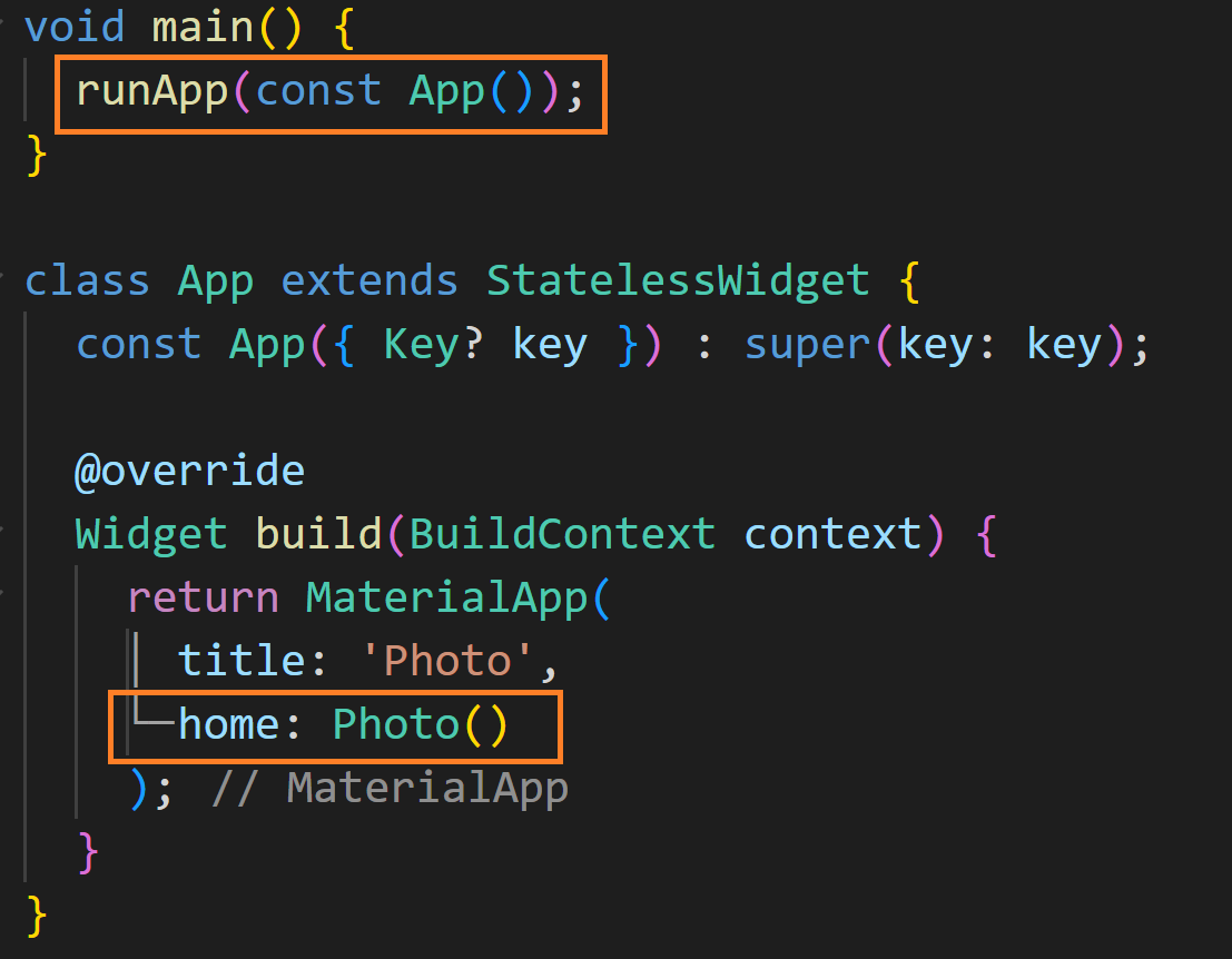 MaterialApp의 home에 방금 만든 Photo 위젯을 넣어주었습니다. 그리고 main 함수에서는 runApp을 호출하고 애플리케이션의 위젯을 전달하면 앱을 구동할 준비가 완료되었습니다.