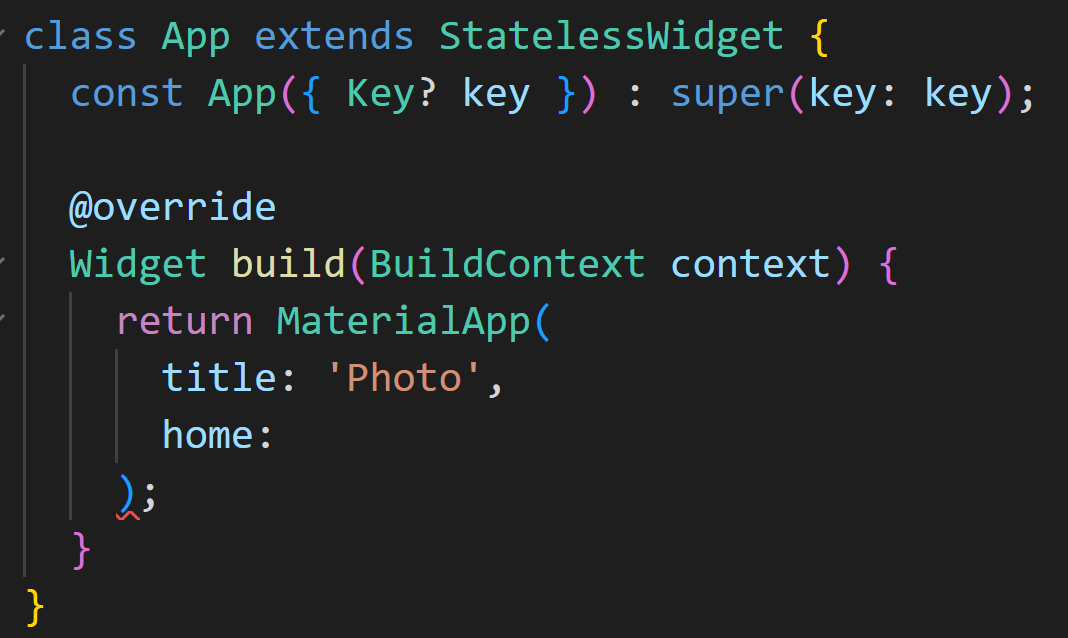 이제 MaterialApp 위젯 내부에서 단일 Photo 위젯을 렌더링 하는 대신 갤러리 위젯을 추가하도록 하겠습니다.