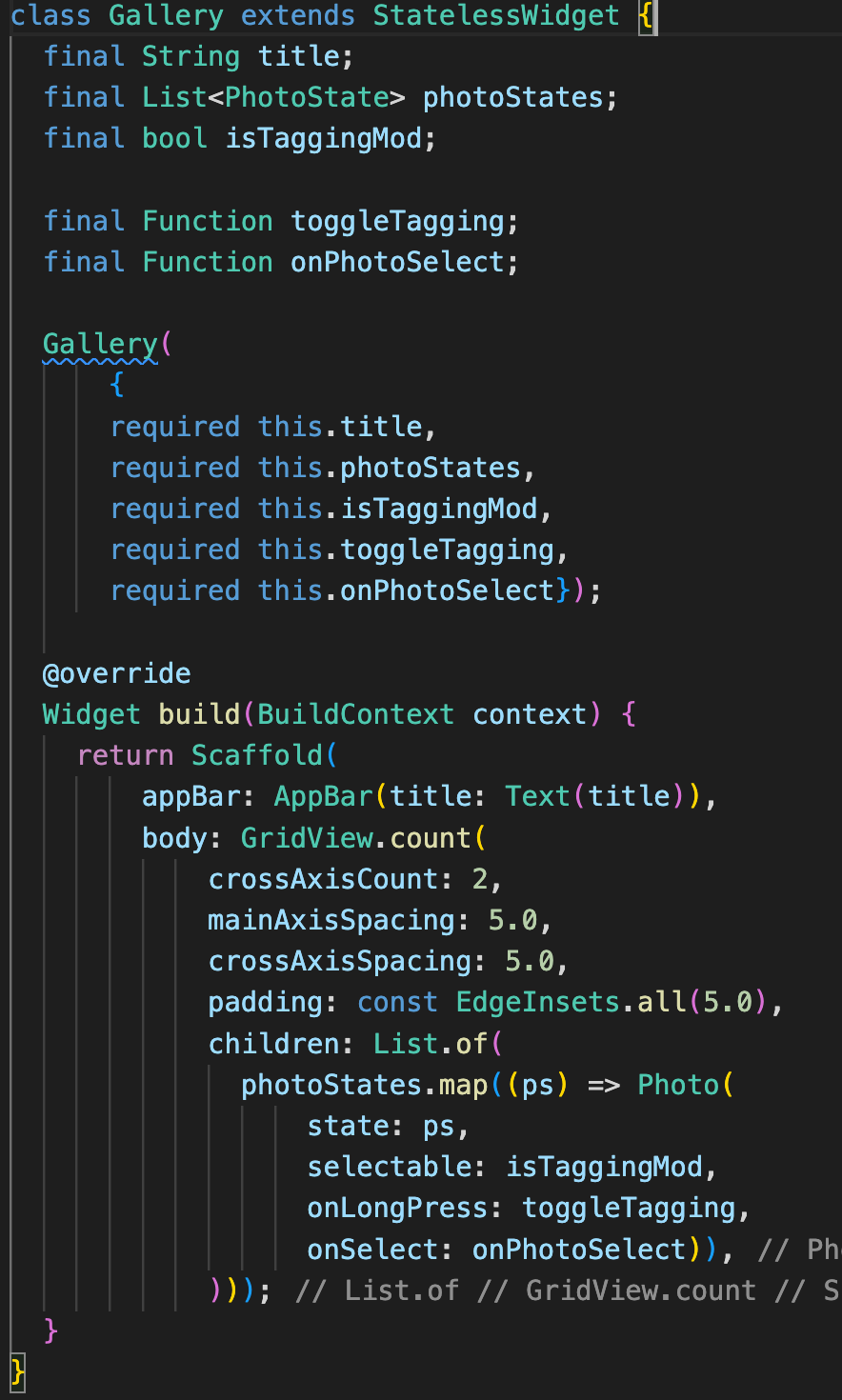 build 메소드에서 MaterialApp을 리턴해 주고 있습니다. MaterialApp의 home 속성에는 Gallery 위젯을 설정해 주고 있습니다. Gallery 위젯을 초기화 할때 사진의 상태 리스트인 photoStates, 상태를 변경시키는 콜백 메소드 onPhotoSelect와 toggleTagging, 태그 모드의 상태 변수인 isTaggingMod를 Gallery위젯에 넣어주고 있습니다.
