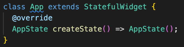 App클래스는 StatefulWidget을 extends 하고 있습니다. App 클래스는 프로퍼티는 존재하지는 않지만 StatefulWidget을 상속받고 있으므로 createState 메서드를 오버라이드 해줘야 합니다. createState에서는 AppState클래스의 인스턴스를 생성할 것입니다.