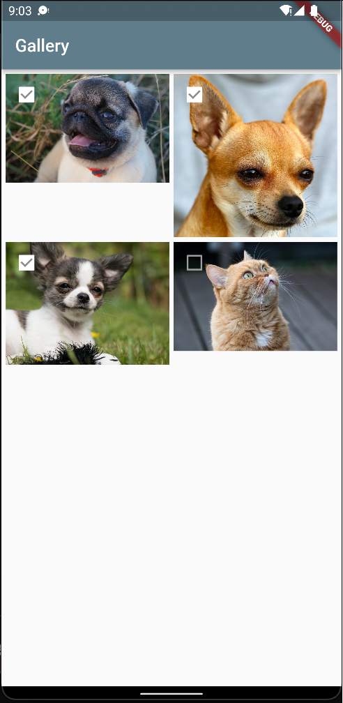 5. CheckBox 에는 onChanged 핸들러가 있으며 체크박스의 값이 바뀔 때마다 호출됩니다. 이것이 호출되면 전달받은 값으로 onSelect 콜백을 호출하여 사진의 url과 체크박스 값을 전달합니다. CheckBox의 value속성에는 현재 값이 설정되어야 하므로 상위 위젯에서 건네받은 state.selected값을 설정하였습니다.