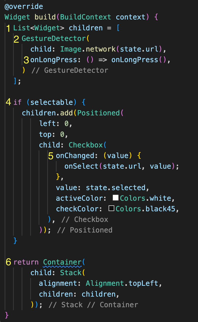 1. 빌드 메소드에서 먼저 할 일은 WIdget리스트를 만드는 일입니다. Widget 리스트를 만드는 이유는 Stack 위젯의 children으로 설정해주기 위해서인데요. 체크박스로 선택 가능한 모드인 태그 모드라면 이미지와 함께 체크박스를 렌더링 해야 되기 때문입니다.
