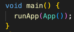 플러터 앱이 부트스트랩 되는 함수로, runApp에 App위젯을 생성하며 넣어주고 있습니다.