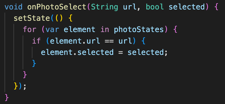 메소드에서는 선택한 사진의 url과 체크박스가 체크되었는지 부울 값 selected가 필요합니다. setState를 호출하여 함수를 전달하고 photoStates 배열을 루프를 돌아 일치하는 url로 해당 객체를 찾은 후 selected 프로퍼티를 갱신해 주고 있습니다.