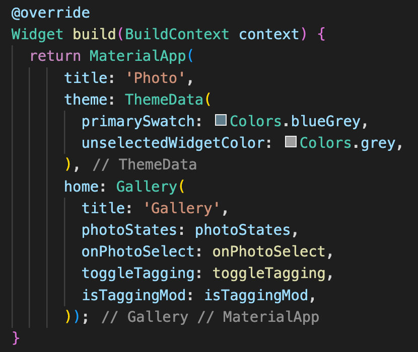 build 메소드에서 MaterialApp을 리턴해 주고 있습니다. MaterialApp의 home 속성에는 Gallery 위젯을 설정해 주고 있습니다. Gallery 위젯을 초기화 할때 사진의 상태 리스트인 photoStates, 상태를 변경시키는 콜백 메소드 onPhotoSelect와 toggleTagging, 태그 모드의 상태 변수인 isTaggingMod를 Gallery위젯에 넣어주고 있습니다.