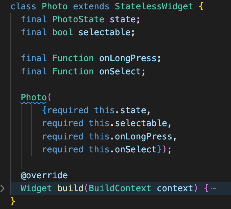 Photo 클래스는 StatelessWidget으로 사진을 담당해주고 있습니다. 프로퍼티로는 사진의 상태인 state, 사진이 태그 모드여서 선택이 가능한 상태인지 나타내는 selectable, 길게 클릭할 때의 콜백 함수인 onLongPress, 체크 박스를 클릭할때 콜백인 onSelect를 가지고 있습니다. 이 프로퍼티들은 Photo 객체가 생성될 때 생성자에서 초기화됩니다. 즉 부모 위젯에서 건네받게 되는 값들입니다.