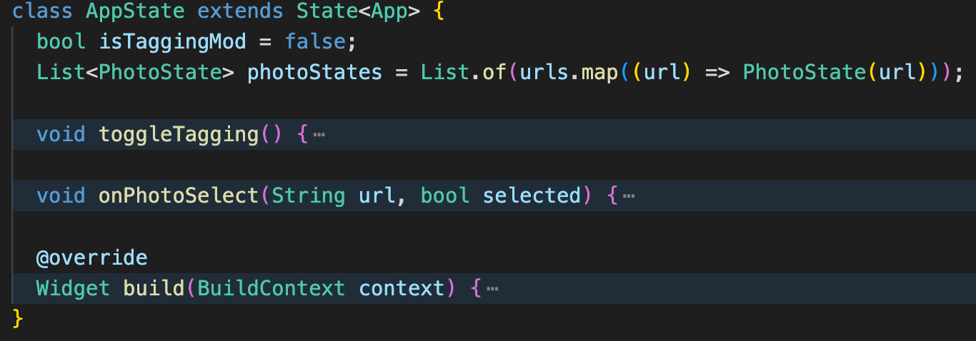 AppState클래스는 State를 상속받고 있습니다. 갤러리는 태그 지정 모드로 전환하는 기능이 필요로 합니다. 태그 모드의 여부를 저장하는 부울 변수인 isTaggingMod를 추가하였고 기본값으로 false를 설정하였습니다. photoStates 프로퍼티는 사진의 상태 리스트를 저장합니다. photoStates는 List.of 함수를 사용하여 루프를 돌며 초기화하고 있는데 url을 새 PhotoState 객체 하나에 하나씩 매핑하고 있습니다. PhotoState는 url 이외에 selected 프로퍼티도 가지고 있는데 기본값으로 false가 설정됩니다.