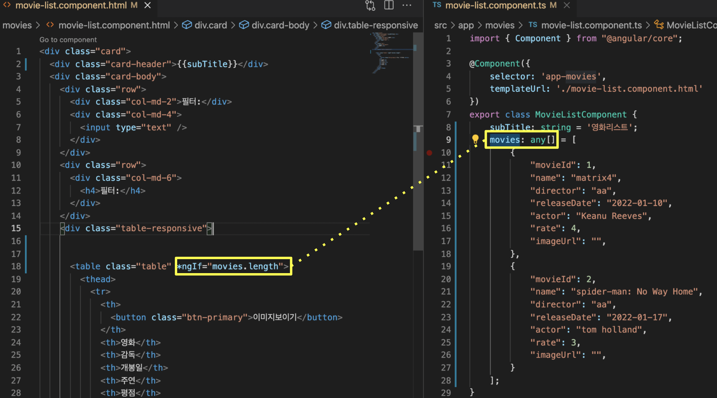 그러기 위해서 ngIf 조건의 판단 재료인 movies를 컴포넌트 속성에 선언을 해야 합니다.