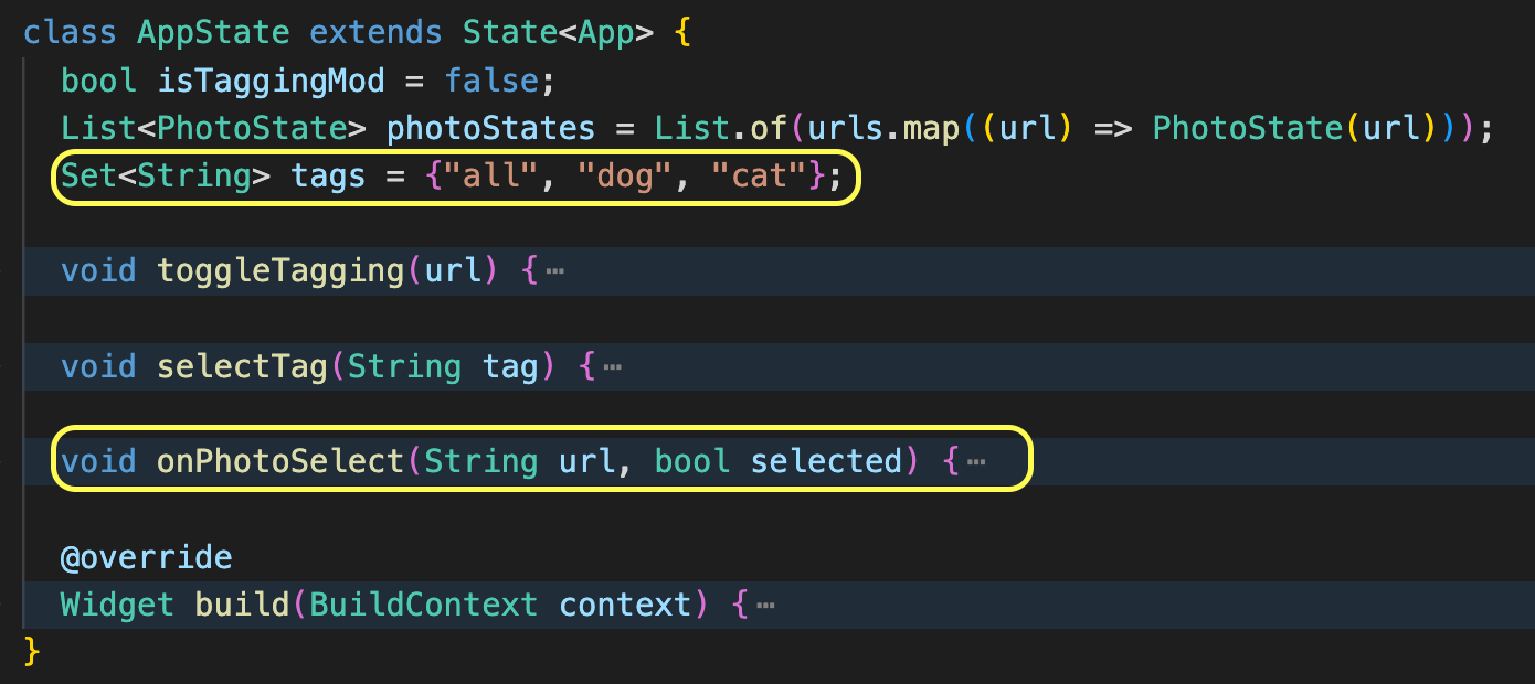 AppState 클래스에서는 Set<String>타입의 tags가 추가되었습니다. 이 tags변수를 사용해서 Drawer의 태그 목록을 표시하게 됩니다. 또한 onPhotoSelect메서드가 추가 되었습니다. 그 외로 사소히 변경된 부분과 함께 살펴보겠습니다.