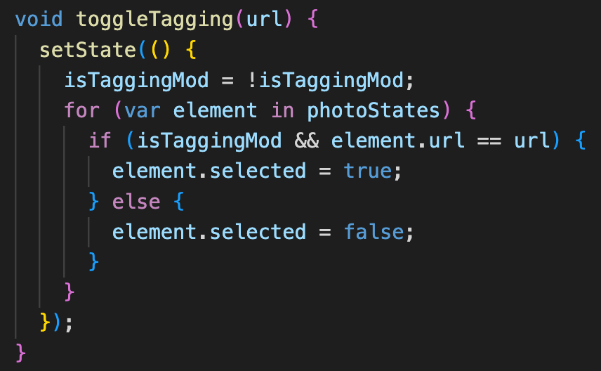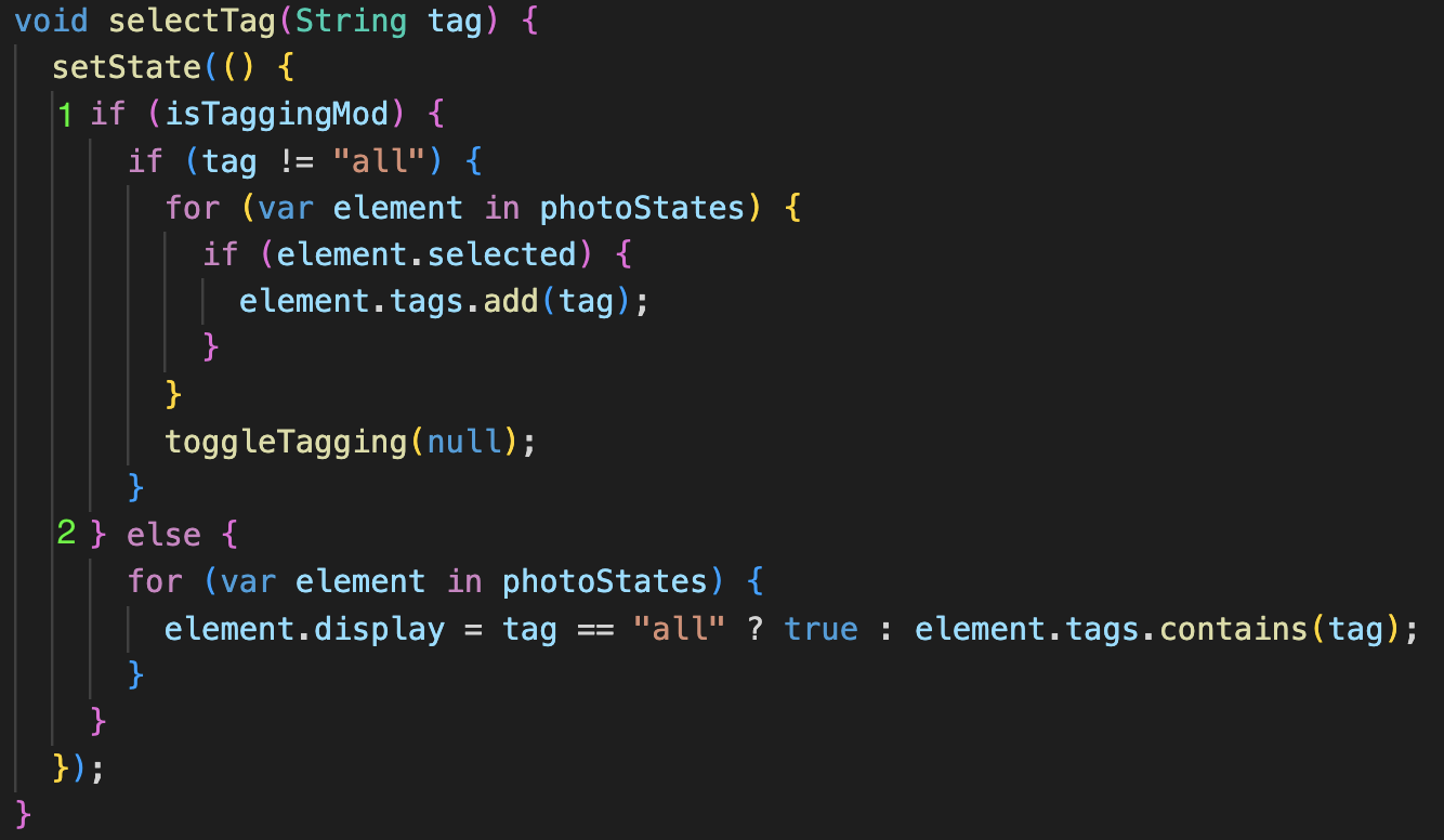 1. 건네주는 함수는 우선 if문으로 태그 모드인지 아닌지 판단하게 됩니다. isTaggingMod가 true 즉 태그 모드일 경우 선택한 태그가 all 아닌 경우에 한해서 photoStates를 루프로 돌며 선택된 사진을 찾아 해당 사진의 tags변수에 선택한 태그를 추가합니다. 그런 후 toggleTagging을 호출해 태그 모드에서 빠져나가게 해 줍니다.