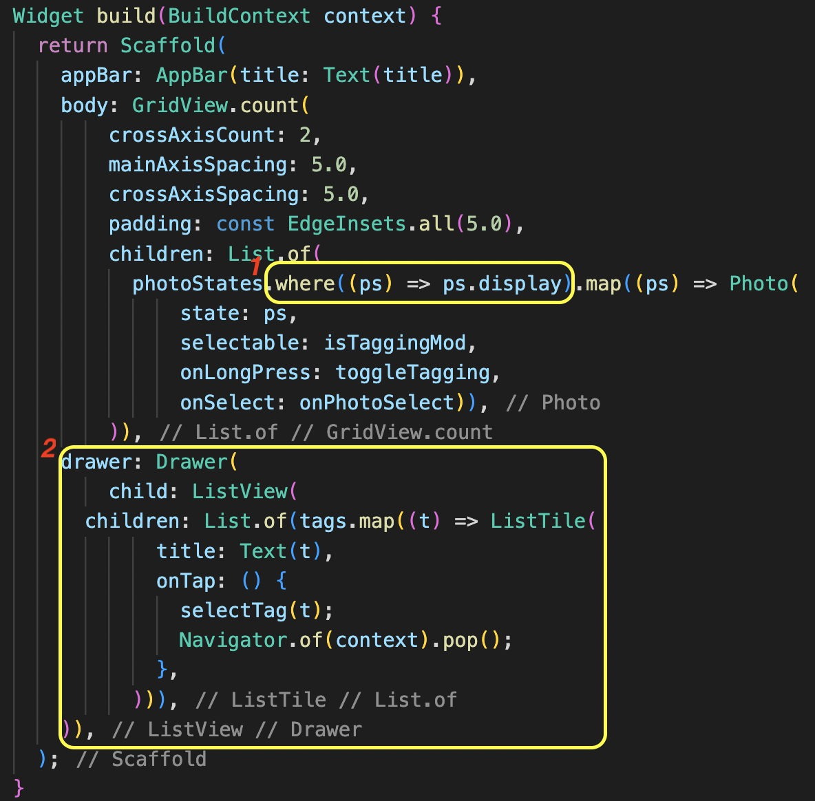 build 메서드에서는 스캐폴드 위젯을 리턴해주고 있고, body에 GridView로 Photo위젯을 표시하며 갤러리를 만들어 주고 있습니다. GridView의 children에서 Photo 위젯의 리스트를 담고 있는데, 변경된 사항이 photoStates의 where메서드를 호출해주고 있다는 점입니다.