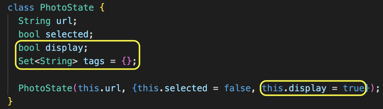 3. PhotoState 클래스는 사진의 상태를 나타내는 위젯이 아닌 단순 클래스입니다. 수정사항은 필터를 통해 사진이 표시되어야 하는지 말아야 하는지 판단하는 변수가 추가됩니다.