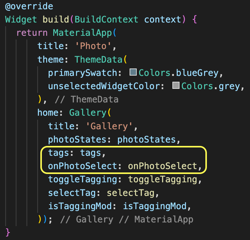 AppState의 build 메서드입니다. MaterialApp을 리턴해주고 있고 home에서 Gallery를 설정해주고 있습니다. 변경된 부분은 새로 추가된 상태 값인 tags와 Drawer에서 목록을 클릭했을 때 실행할 콜백 메서드를 하위 위젯에 건네주는 부분입니다.