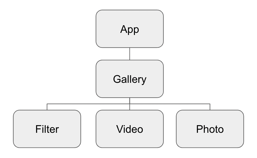 App이 있고 하위 위젯으로 Gallery를 가지고 있습니다. 그리고 Gallery는 세 개의 하위 위젯 Filter, Video, Photo를 가지고 있습니다. 상태를 공유한다는 생각은 위젯 트리에서 상위에 어떤 상태가 있다고 생각할 수 있습니다. App에서 상태를 가지고 있다고 해보겠습니다.