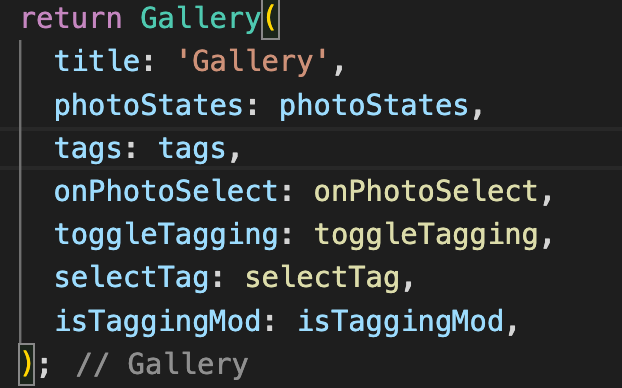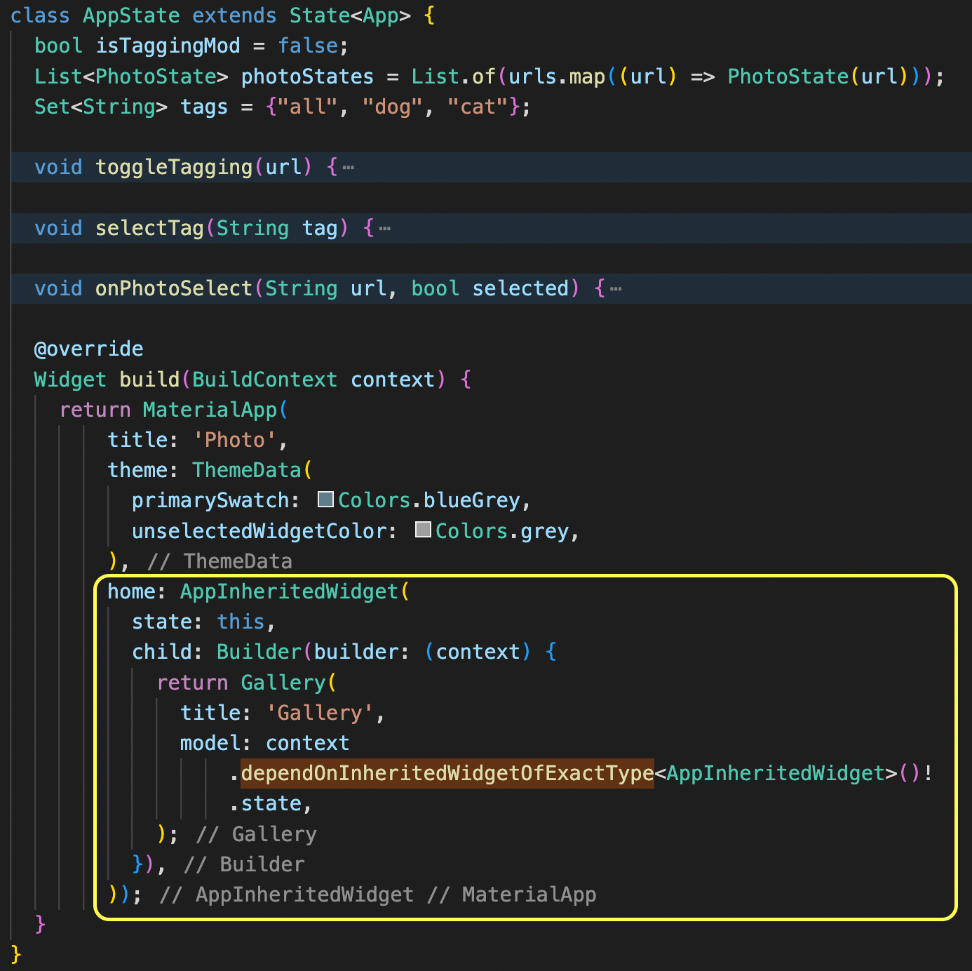3. Photo를 생성할때 Gallery를 생성할 때와 마찬가지로 Photo에서 필요한 상태를 AppInheritedWidget으로부터 가져와 건네주고 있습니다.