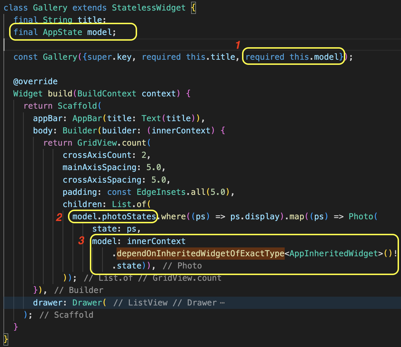 1. 이전 생성자에서는 여러 속성들이 필요했던 반면 이제 InheritedWidget에서 가져온 상태를 초기화해주고 있습니다. Gallery를 생성할 때 InheritedWidget을 사용하지 않고 하위 위젯에 모든걸 전달해주었던 소스와 비교해 보면 확연히 줄어든 모습입니다.