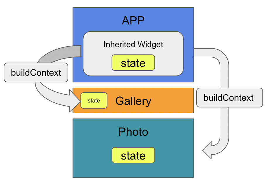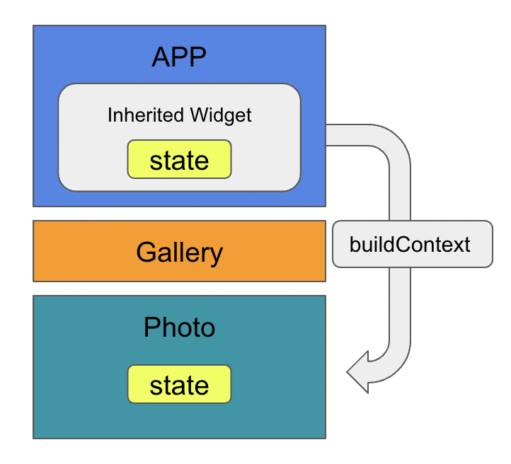 App, Gallery, Photo 위젯이 있습니다. 우선 App 내에서 InheritedWidget을 만들 것입니다. InheritedWIdget에는 상태와 해당 상태를 조작할 수 있는 함수가 포함된 State가 포함됩니다. 이제 BuildContext를 사용하게 됩니다. 빌드 메서드 내부에서 buildContext를 수신할 것이며, BuildContext를 사용해서 InheritedWidget에서 하위 위젯으로 직접 통신을 하게 될 것입니다.