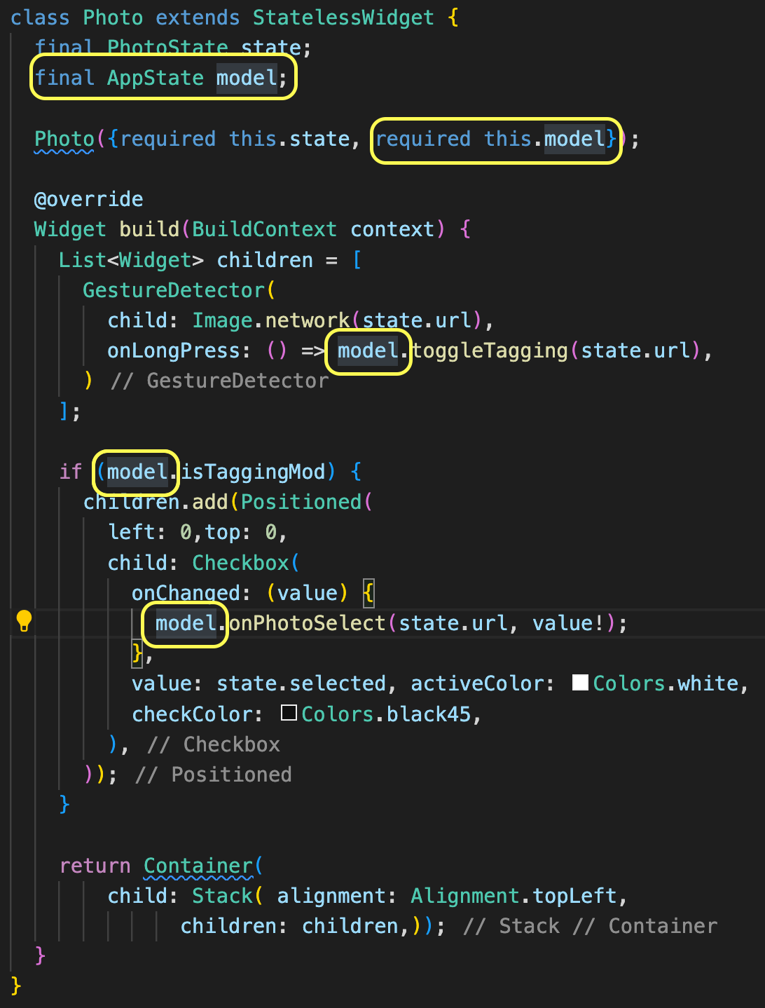 Photo 위젯에서 변경된 점은 상위 위젯에서 전달되었던 상태 정보들이 제거되었고, 대신에 InheritedWidget에서 가져온 state(AppState)를 건네받게 되었습니다. 이제 AppState인 model을 이용하여 콜백과 프로퍼티들을 접근할 수 있게 되었습니다.