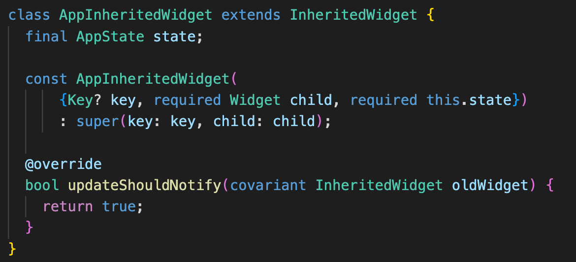 class AppInheritedWidget extends InheritedWidget {