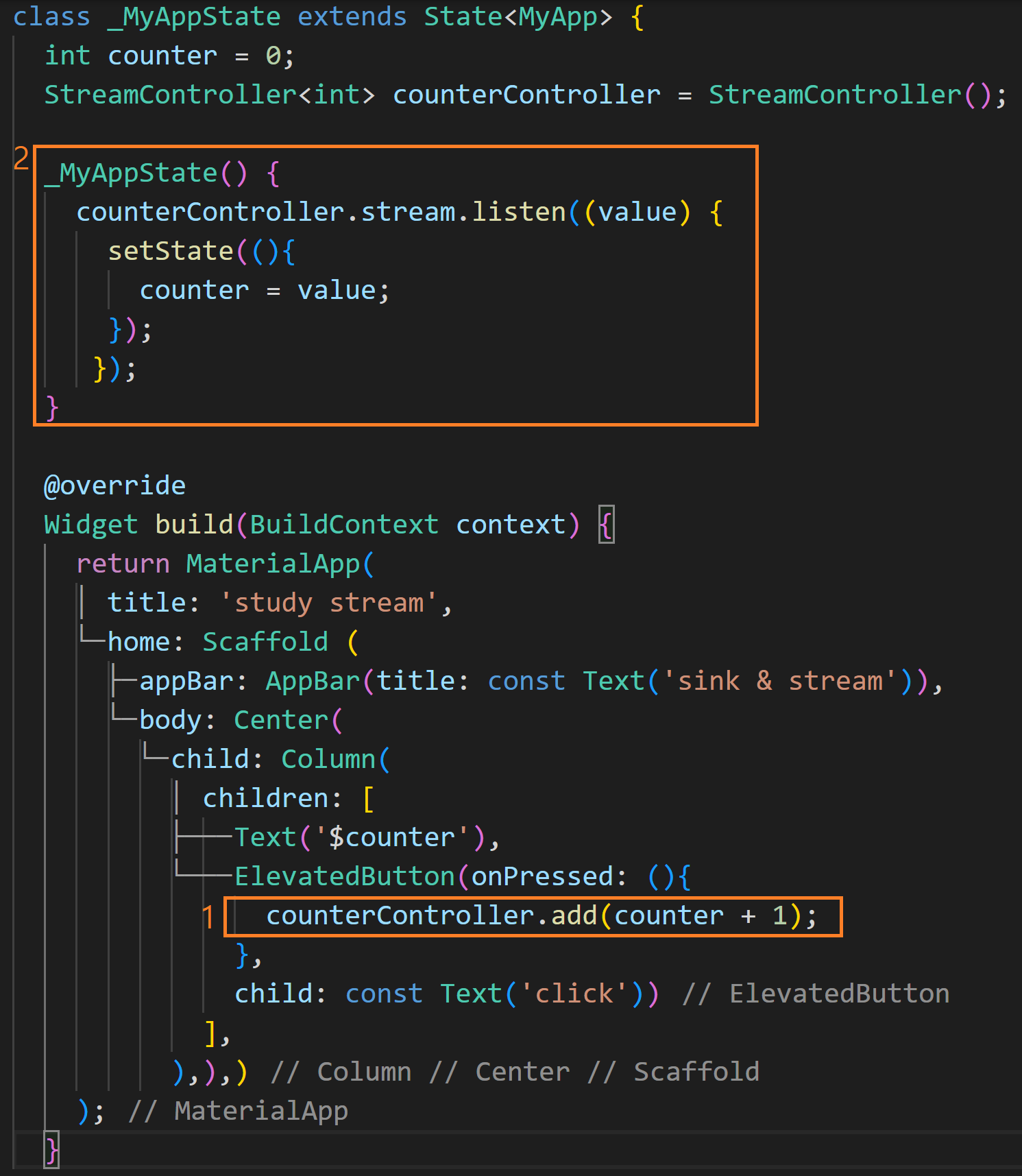 2. stream 처리를 하고 있습니다. 생성자 안에서 리스너를 추가해주고 있는데요. 싱크는 메시지를 추가하는 곳이고 스트림은 메시지를 다시 내보내는 곳입니다. counterController.stream.listen 으로 리스너를 통해 메시지를 건네받게 됩니다. listen메서드는 들어오는 메시지를 처리하는 함수를 설정해 줄 수 있습니다. 전달된 값을 counter에 할당하는 함수를 setState에 설정해 주면 위젯이 업데이트됩니다.