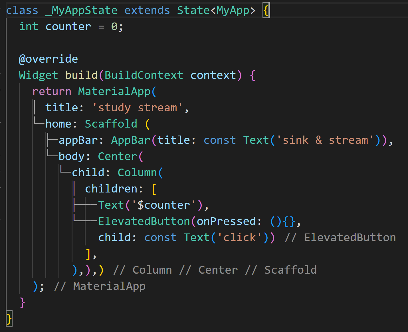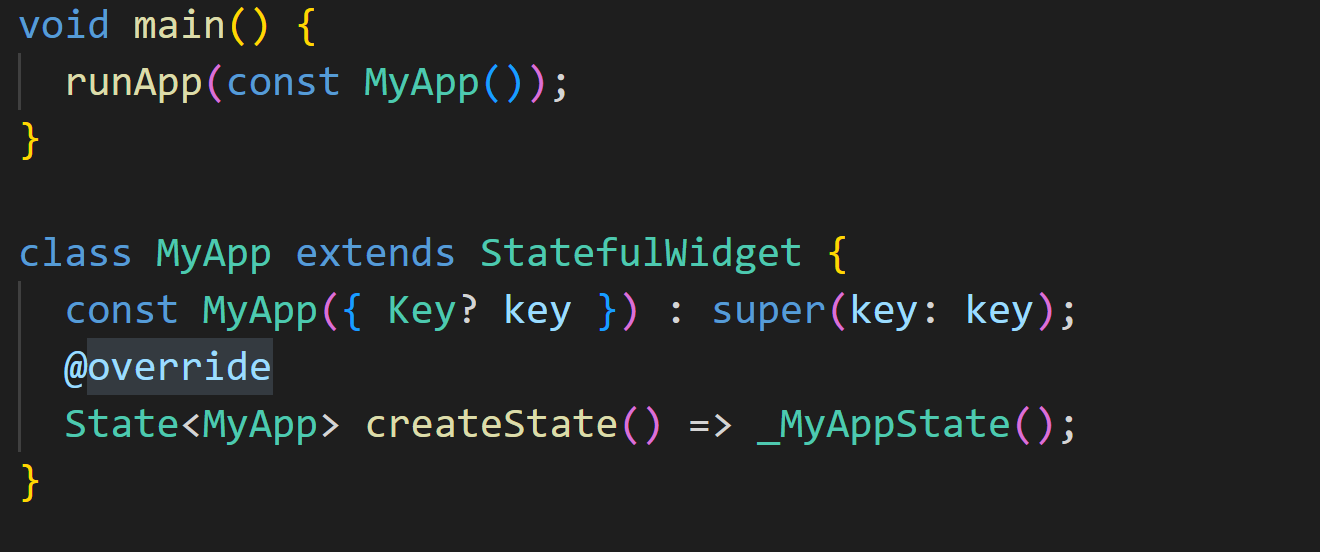 MyApp 위젯을 스테이트풀 위젯으로 만들어 주었고 main메소드의 runApp에서 MyApp 객체를 넣어주고 있습니다. _MyAppState 클래스는 다음과 같습니다.