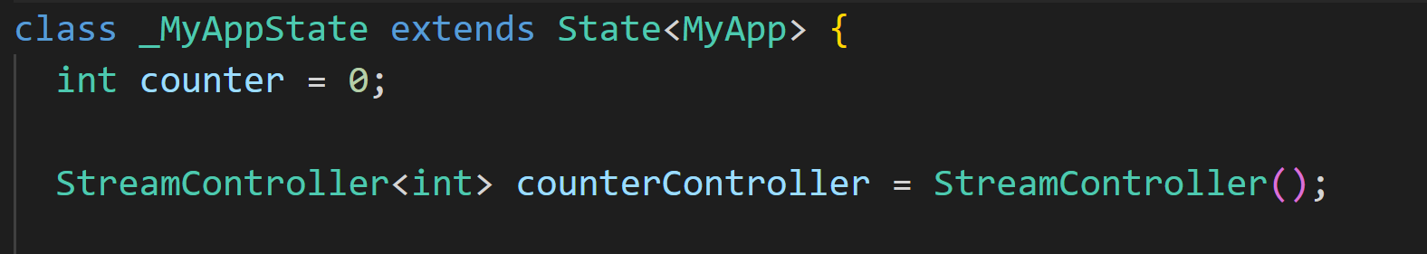 StreamController는 counter를 컨트롤해줘야 하고 정수 유형의 메시지를 처리해야 하므로 int 타입으로 만들어 주고 있습니다. 기본적으로 StreamController 와 스트림은 하나의 리스너에게만 메시지를 보냅니다. 만약 여러 리스너에게 브로드캐스트 해야 할 경우에는 broadcast생성자 함수를 사용해야 합니다. 위에서 언급했듯이 StreamController에는 sink와 stream 두 개의 측면이 존재합니다. 싱크를 사용하여 데이터를 추가하고 스트림을 사용해서 컨트롤러에서 데이터를 가져오도록 수정하겠습니다.