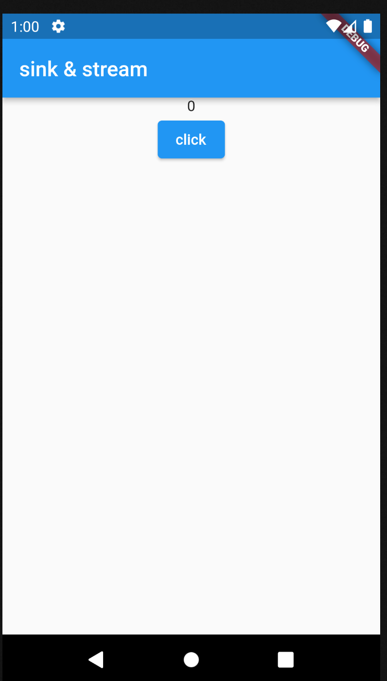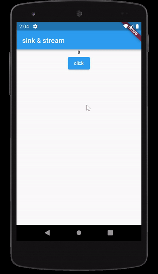 1. sink 처리입니다. 이제 버튼을 클릭했을 때 onPressed 핸들러에서 상태 값을 업데이트해줘야 합니다. counterController를 이용해서 add를 호출하고 있습니다. add는 sink에 다른 메시지를 추가해줍니다. 이로서 클릭을 하게 되면 컨트롤러는 처리해야 할 다른 메시지를 갖게 됩니다. 현재 counter 값에서 1을 증가하고 하고 add에 설정해주고 있습니다. 하지만 싱크에 다른 메시지를 추가하더라도 자동으로 메시지를 읽어오지는 않기 때문에 이것만으론 애플리케이션 상태를 업데이트하지 않습니다. 따라서 stream 처리를 해줘야 합니다.