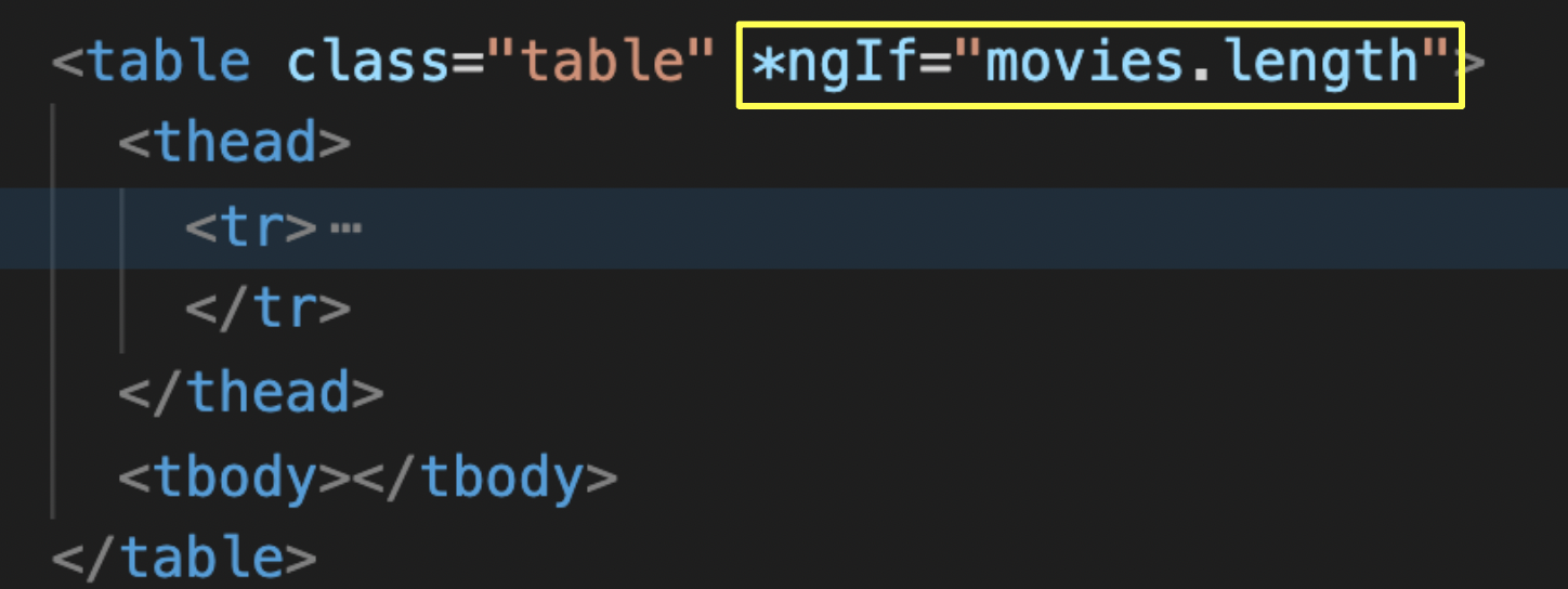 DOM에서 추가하거나 제거할 요소는 테이블 이므로 테이블의 속성에 *ngIf=를 입력한 다음 따옴표로 묶인 표현식을 입력합니다.